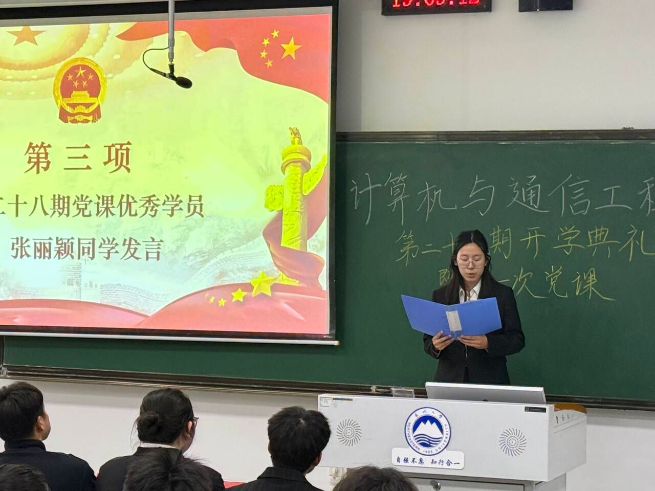 第二十八期党校优秀学员代表张丽颖作发言。她结合自身党课学习成长经历,分享理论学习收获与实践锻炼心得,鼓励新学员珍惜学习机会,持续提升思想觉悟。随后,第二十九期党校新生代表李沂燃作表态发言,表达了对党组织的崇敬之情与向党组织靠拢的坚定决心,承诺将以饱满热情投入学习,以实际行动争取早日加入中国共产党。