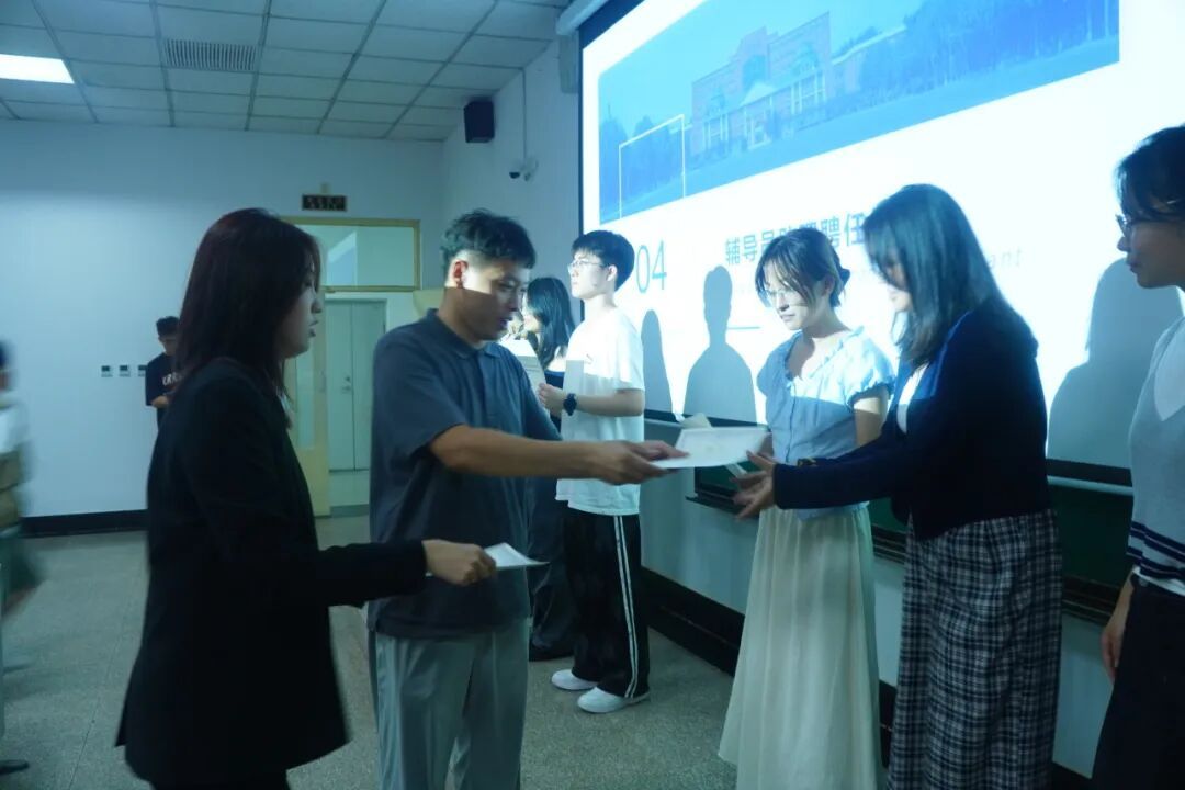 助导聘任环节中,尹亚冲、樊灵伟为2025级全体辅导员助理颁发聘书并合影。助导代表承诺将尽职尽责为新生提供学业指导与生活支持,助力快速融入大学环境。