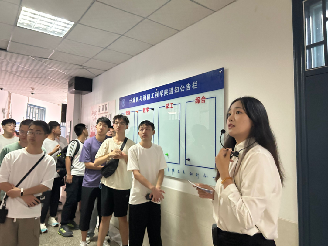 当日午后,讲解员提前在基础楼门口等候。首批新生集合后,讲解正式启动。新生们跟随讲解员深入基础楼,学院风貌逐步展开:正门前 “明德笃学,求是创新” 的院训,彰显计工学子的自律追求;楼内文字展板系统呈现学院发展历程与成就,照片墙展示优秀校友成长轨迹,各类奖杯奖状则直观体现学院实力与一代代计工人的贡献。单班参观结束后,讲解员短暂休整,随即迎接下一批新生。