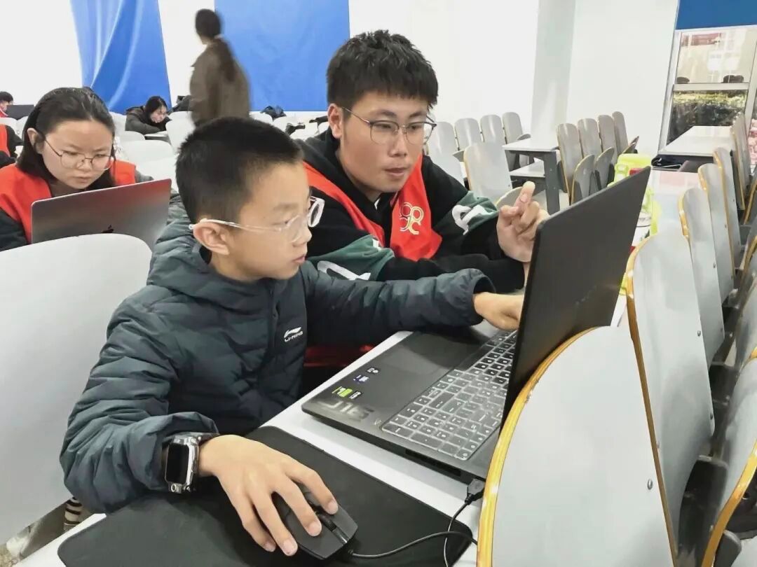 活动现场,志愿者们化身专业又亲切的“编程导师”,以童趣化的语言和互动式的教学打破技术壁垒,为小朋友们揭开编程的神秘面纱。从编程界面的趣味认知,到C语言基础语法的通俗讲解,再到简单程序代码的动手编写,“小老师”们循循善诱,带领孩子们一步步探索代码世界的奥秘。在课堂设置的趣味编程小任务中,孩子们在志愿者们的悉心指导下,亲眼见证自己编写的程序成功运行——当屏幕上跳出预期的结果时,童真的脸庞上满是兴奋与自豪的光芒。