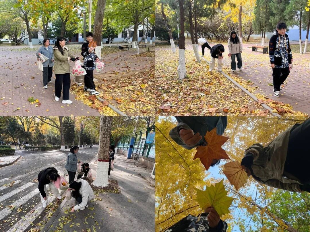 活动伊始,同学们沿着预设的校园路线,开展了一场充满乐趣的“拾秋”之旅。大家兴致勃勃地穿梭于深秋的校园,捡拾着飘落的各式树叶——金黄的银杏、火红的枫叶,每一片叶子都承载着大自然独特的色彩和纹理。这不仅是简单的素材收集过程,更是同学们亲近自然、体验劳动乐趣的实践时刻。在环绕校园一周后,大家回到了学院的“一站式”学生社区,准备将这些自然馈赠转化为艺术作品。