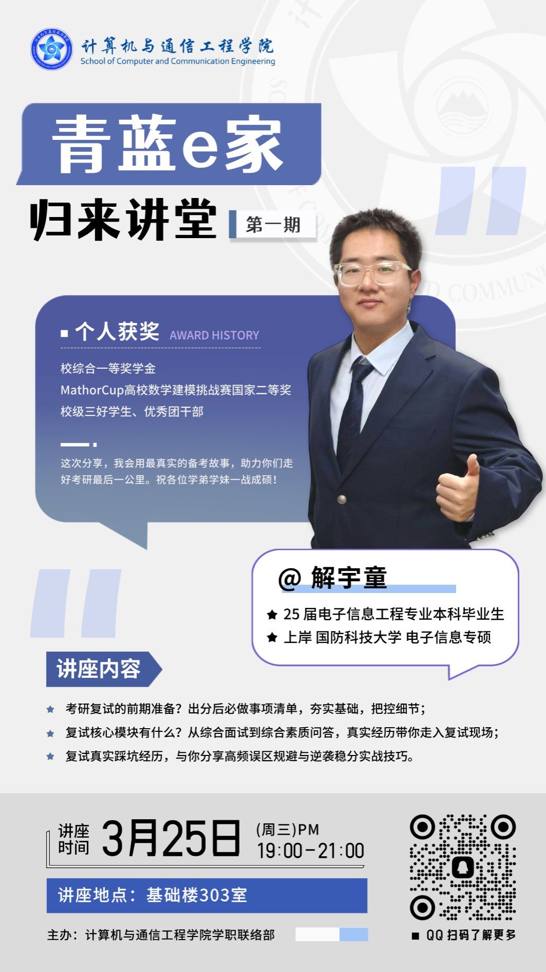 3月25日晚,我院“青蓝e家·归来讲堂”第一期院友讲座在基础楼303室以线上形式开讲。本次讲座邀请2025届电子信息工程专业毕业生、现国防科技大学电子信息专业硕士生解宇童担任主讲,吸引了我院近30名学生参与。