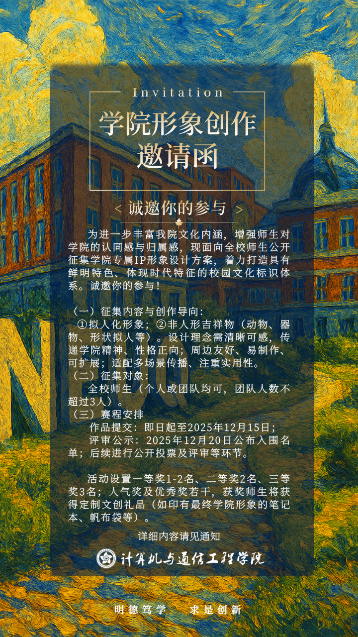 为进一步丰富我院文化内涵,增强师生对学院的认同感与归属感,现面向全校师生公开征集学院专属IP形象设计方案,着力打造具有鲜明特色、体现时代特征的校园文化标识体系。诚邀你的参与!