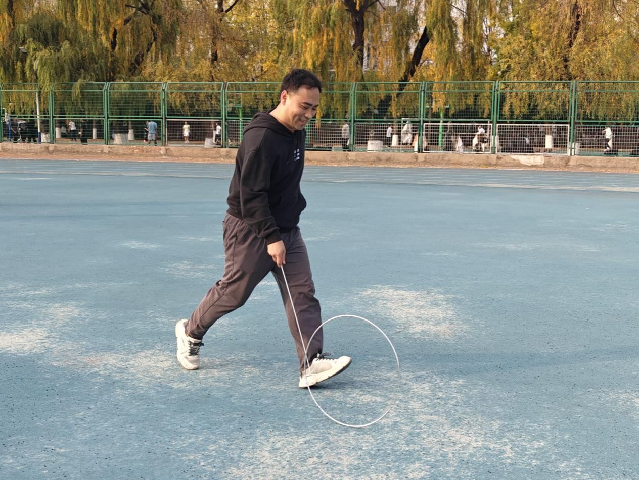 速度与平衡的较量同样精彩。“袋鼠跳”赛场,师生套上布袋蹦跳向前,憨态可掬却不失冲劲;“协力踏云”项目里,两人一组同步迈步,在节奏与平衡的把控中奋力冲刺;“滚铁环”赛道上,大家重拾童年记忆,手握铁钩稳步推进,在怀旧与竞技中收获亮眼成绩,每一次跨越都引来现场阵阵欢呼。
