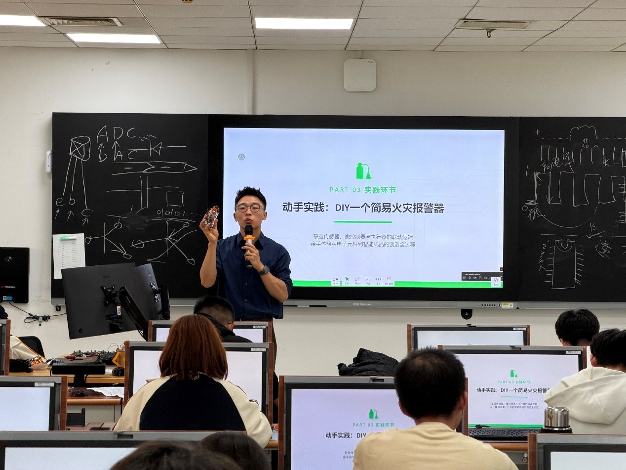 在实践讲解环节,刘少楠结合简易火灾报警器的制作过程进行了细致讲解。通过将理论知识与实际案例相结合,同学们不仅感受到动手实践的乐趣,也进一步增强了安全意识和将知识转化为实际应用的能力。