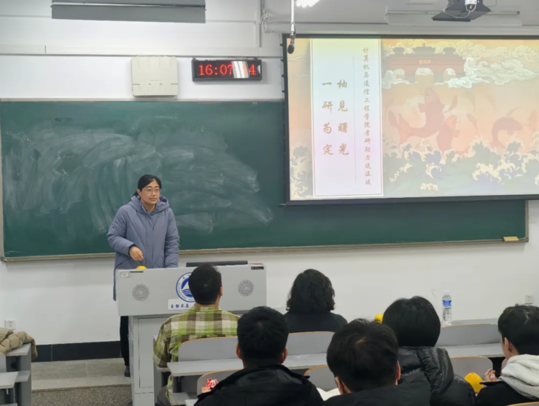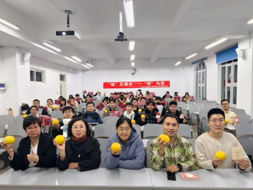 11月28日下午,计算机与通信工程学院在工学馆107室举办“‘柚’见曙光,一‘研’为定”考研送温暖活动,出席本次活动的嘉宾有计算机与通信工程学院院长宋昕,党委书记李杰,党委副书记、副院长连凯宇,学生办公室主任陈晶晶,辅导员庄天宇,以及2026届考研报名同学。